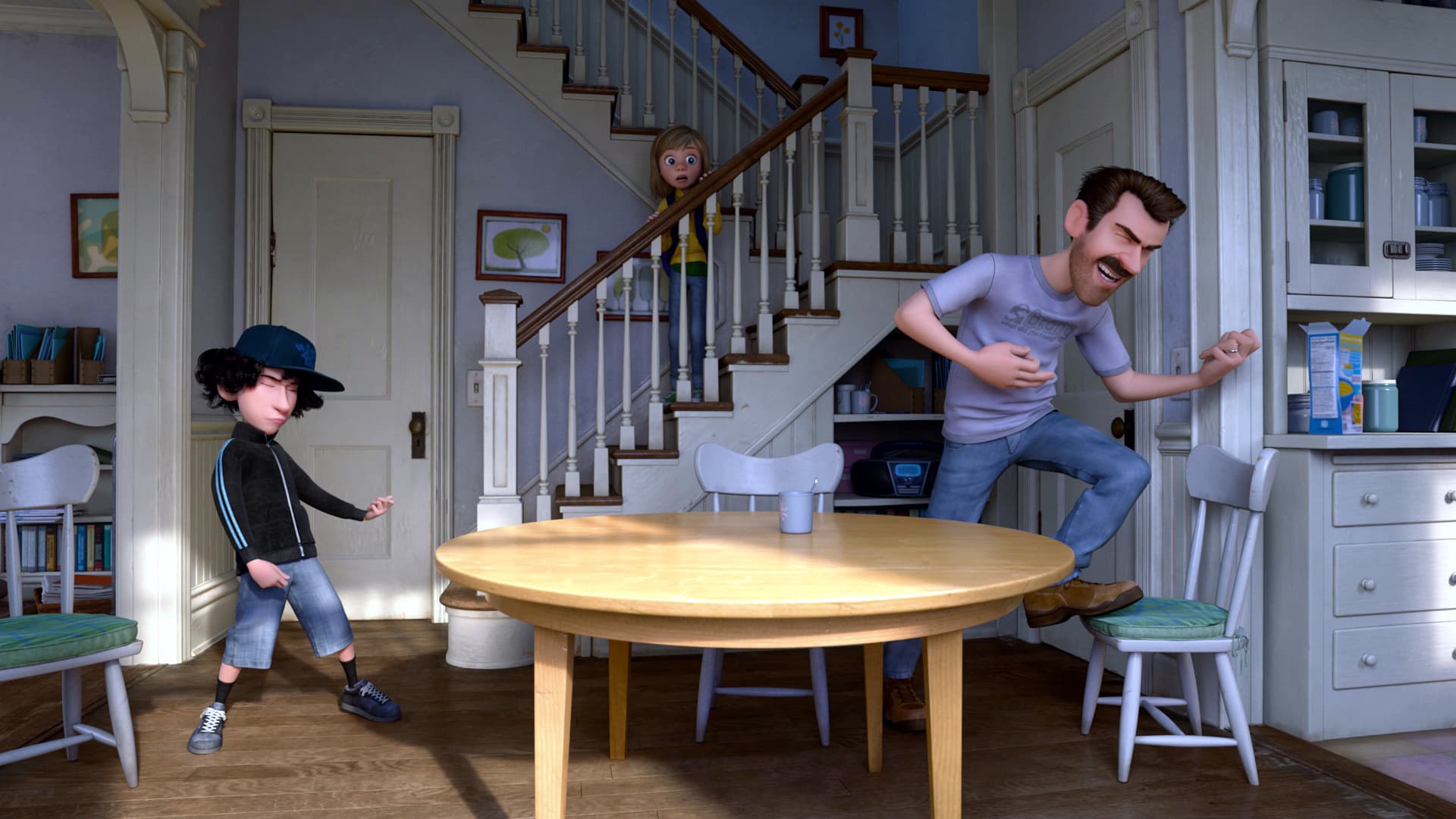 Quand Jordan arrive à la maison, le père de Riley se montre brusque et cherche à l'impressionner par une attitude interrogatrice. La scène reste comique, mais un jeune enfant sensible peut percevoir une petite tension sociale, car le garçon semble déstabilisé et ne comprend pas bien ce qu'on attend de lui. La mère de Riley tente de parler du possible rendez-vous en utilisant un langage qu'elle croit moderne, ce qui embarrasse fortement sa fille. Ce passage ne contient rien de choquant, mais il repose sur un malaise adolescent très reconnaissable qui peut demander une petite explication aux plus jeunes sur les notions de crush et de sortie entre amis. Un moment de musique énergique provoque un peu de désordre dans la maison, avec des meubles renversés dans une ambiance de comédie physique. Il n'y a pas de blessure ni de danger réel, mais les plus petits peuvent être brièvement surpris par le volume, l'agitation et l'excitation des adultes.